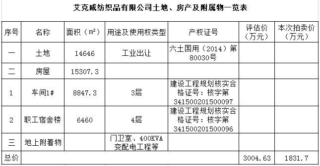一、拍賣標(biāo)的:位于六安市金安經(jīng)濟(jì)開(kāi)發(fā)區(qū)鳳凰路與山源路交匯處六安艾克威紡織品有限公司所擁有的房產(chǎn)(約15307.3㎡)、工業(yè)土地(約14646㎡)、附屬物等,整體變賣,參考價(jià)1831.7萬(wàn)元。