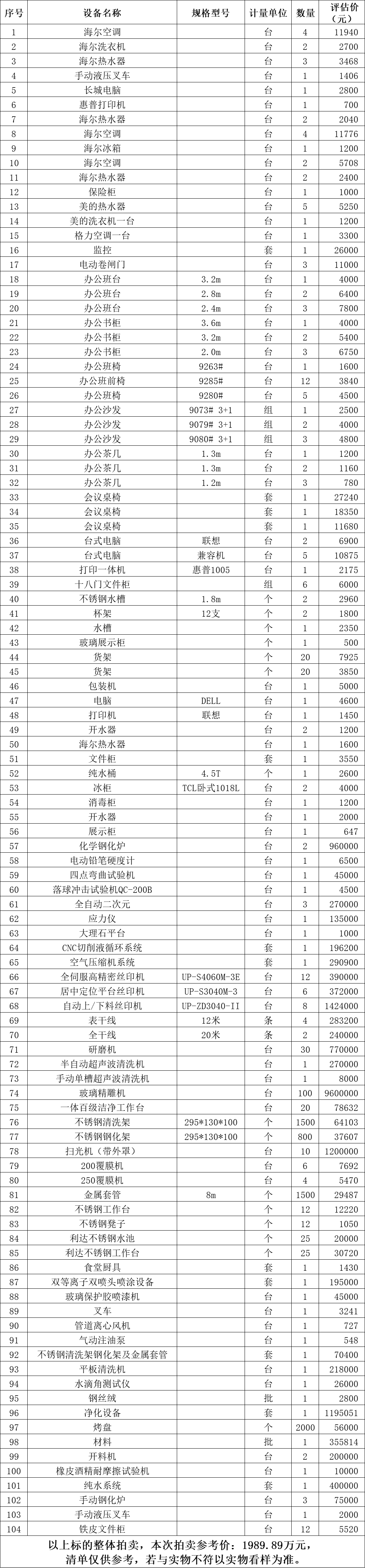 以現(xiàn)狀拍賣,現(xiàn)狀移交。標(biāo)的清單見下方表格。所附清單上標(biāo)的的數(shù)量及規(guī)格型號(hào)、廠家等信息僅供參考,若與實(shí)物不符以實(shí)物看樣為準(zhǔn),成交后以現(xiàn)場實(shí)物為準(zhǔn)移交。成交后,委托方提供增值稅專用發(fā)票。