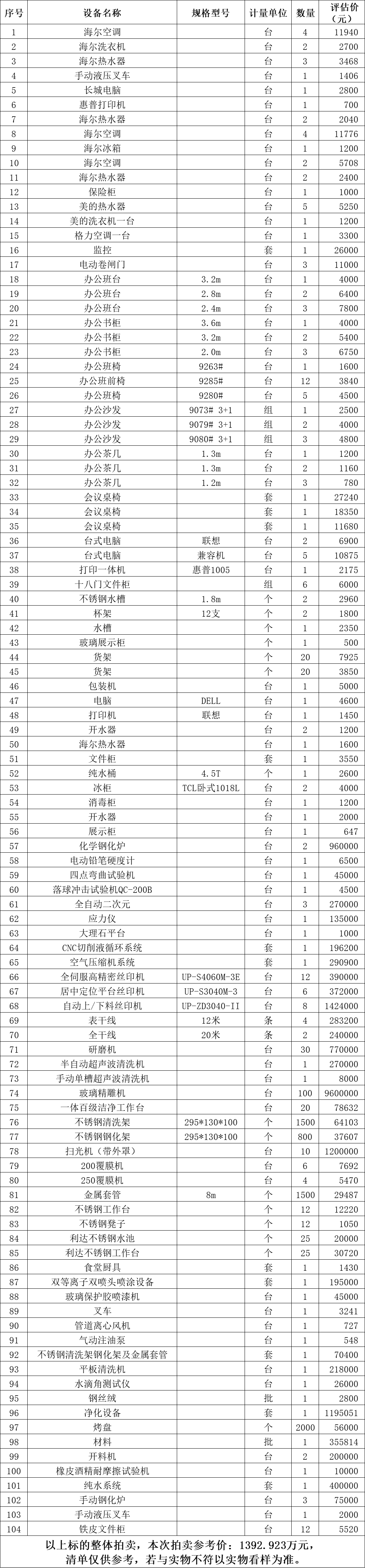 以現(xiàn)狀拍賣,現(xiàn)狀移交。標(biāo)的清單見下方表格。所附清單上標(biāo)的的數(shù)量及規(guī)格型號、廠家等信息僅供參考,若與實物不符以實物看樣為準(zhǔn),成交后以現(xiàn)場實物為準(zhǔn)移交。成交后,委托方提供增值稅專用發(fā)票。