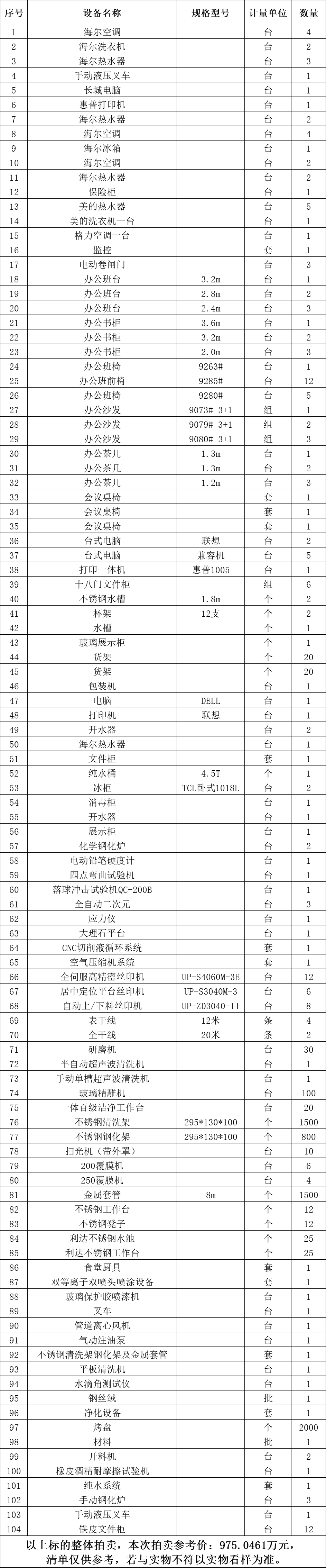 一、拍賣標(biāo)的:玻璃精雕機(jī)、自動(dòng)上/下料絲印機(jī)、掃光機(jī)、凈化設(shè)備、研磨機(jī)、純水系統(tǒng)等二手設(shè)備一批,整體拍賣,參考價(jià):975.0461萬元。競(jìng)買保證金:100萬元。