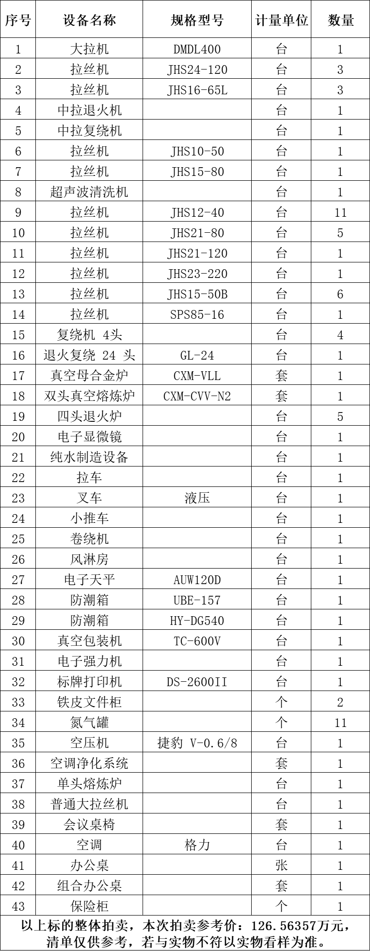 一、拍賣標(biāo)的:雙頭真空熔煉爐、真空母合金爐、空調(diào)凈化系統(tǒng)、拉絲機(jī)、復(fù)繞機(jī)4頭、大拉機(jī)、單頭熔煉爐等二手設(shè)備一批,整體拍賣,參考價(jià):126.56357萬元。競買保證金:15萬元。
