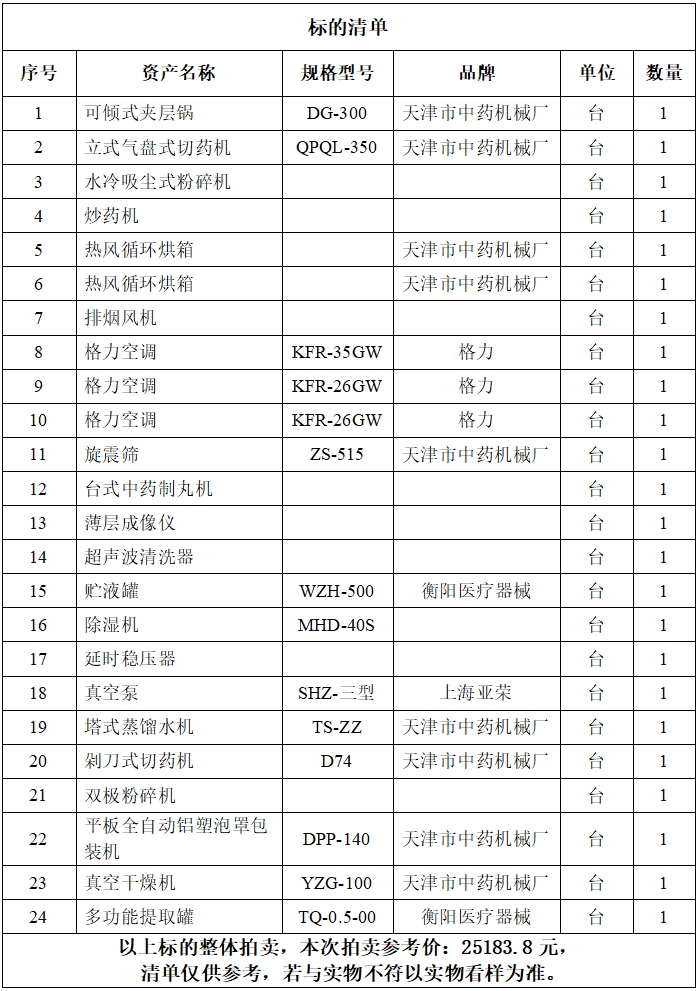 一、拍賣標(biāo)的:六安市中醫(yī)院制劑室報(bào)廢設(shè)備一批,包括組合空調(diào)箱、真空干燥機(jī)、平板全自動(dòng)鋁塑泡罩包裝機(jī)、風(fēng)冷模板等,參考價(jià):25183.8元,競買保證金:5000元。