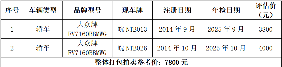 一、拍賣標(biāo)的:皖NTB013、皖NTB026大眾捷達(dá)等兩輛二手車整體打包拍賣,參考價(jià):7800元,競(jìng)買保證金:5000元。標(biāo)的詳情見(jiàn)下表: