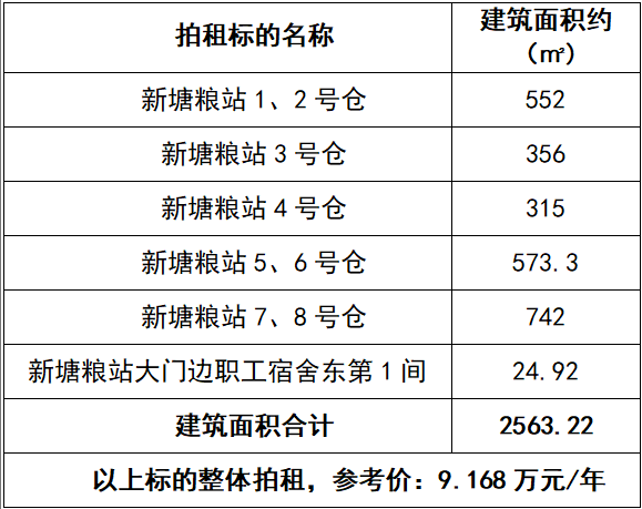 一、拍租標的:六安市金安糧食購銷有限公司新塘糧站1-8號倉及糧站大門邊職工宿舍東第1間房屋3年期租賃經(jīng)營權,整體拍租,建筑面積約:2563.22 ㎡,參考價:9.168萬元/年。標的詳情見下表: