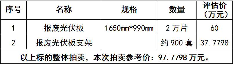 一、拍賣(mài)標(biāo)的:報(bào)廢光伏板2萬(wàn)片及報(bào)廢光伏板支架約900套,整體拍賣(mài),參考價(jià):97.7798萬(wàn)元。競(jìng)買(mǎi)保證金:15萬(wàn)元。
