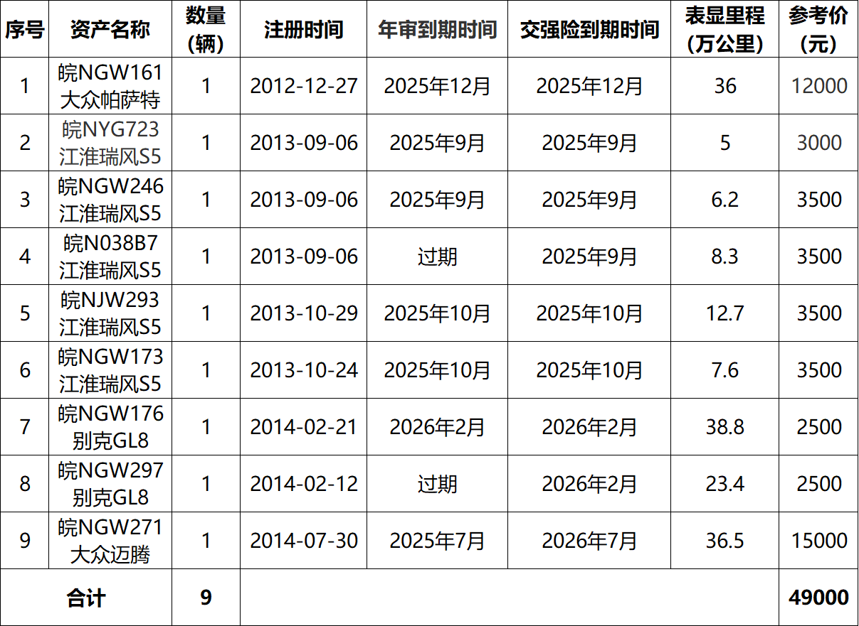 一、拍賣(mài)標(biāo)的:皖NGW161大眾帕薩特、皖NYG723江淮瑞風(fēng)等二手車(chē)9輛,整體打包拍賣(mài),整體參考價(jià):4.9萬(wàn)元。競(jìng)買(mǎi)保證金:1萬(wàn)元。標(biāo)的詳情見(jiàn)下方清單: