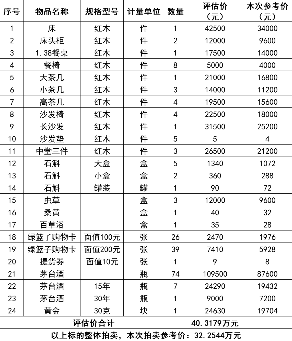 一、拍賣標(biāo)的:茅臺(tái)酒、黃金、紅木家具等物品一批,整體打包拍賣,參考價(jià):32.2544萬(wàn)元。競(jìng)買保證金:6萬(wàn)元。詳見(jiàn)下方明細(xì)表: