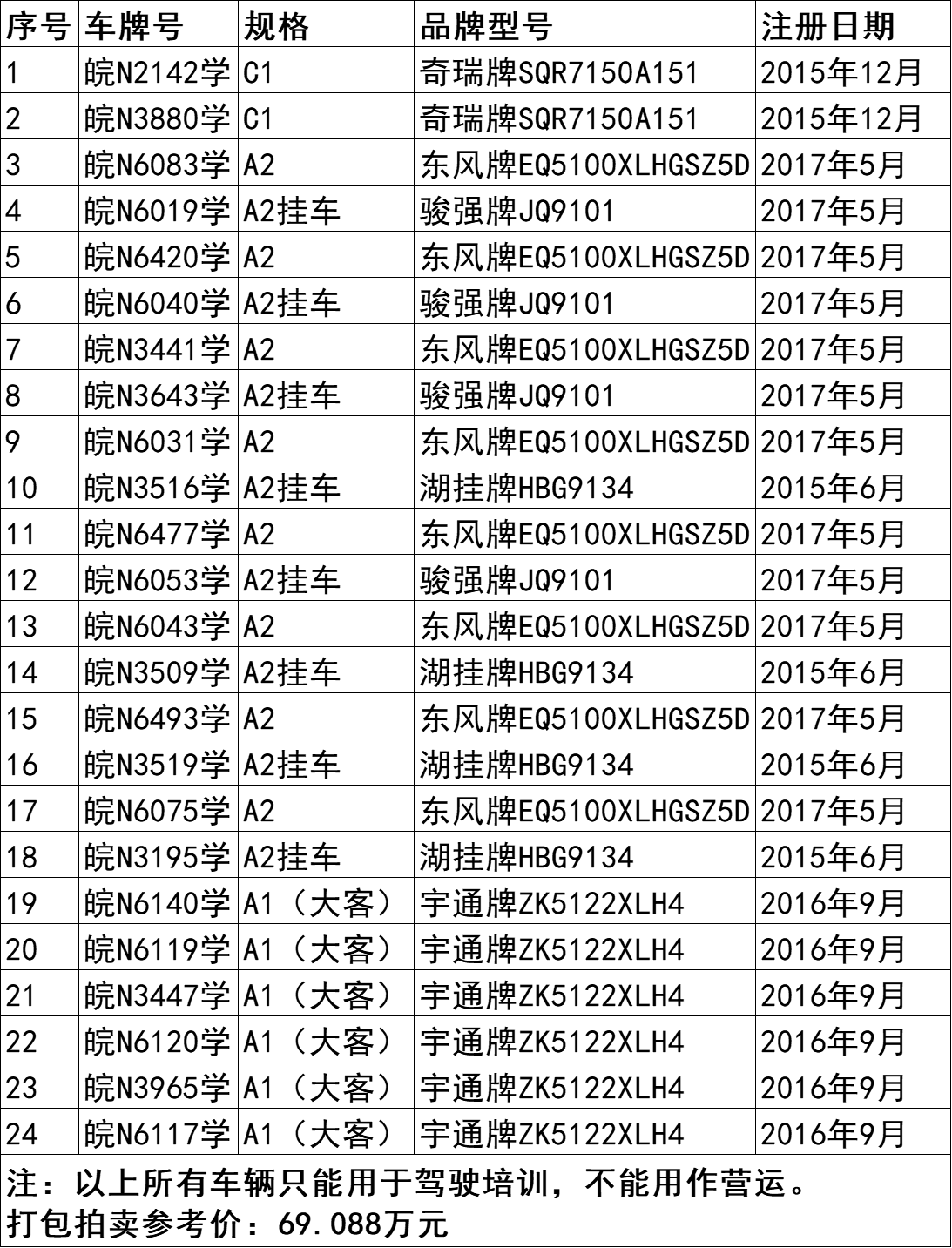 3、皖N2142學(xué)、皖N3880學(xué)奇瑞牌小轎車、皖N6140學(xué)宇通牌大客等24臺(tái)二手車,打包拍賣。參考價(jià):69.088萬元,競(jìng)買保證金:8萬元。標(biāo)的詳情見下方表格: