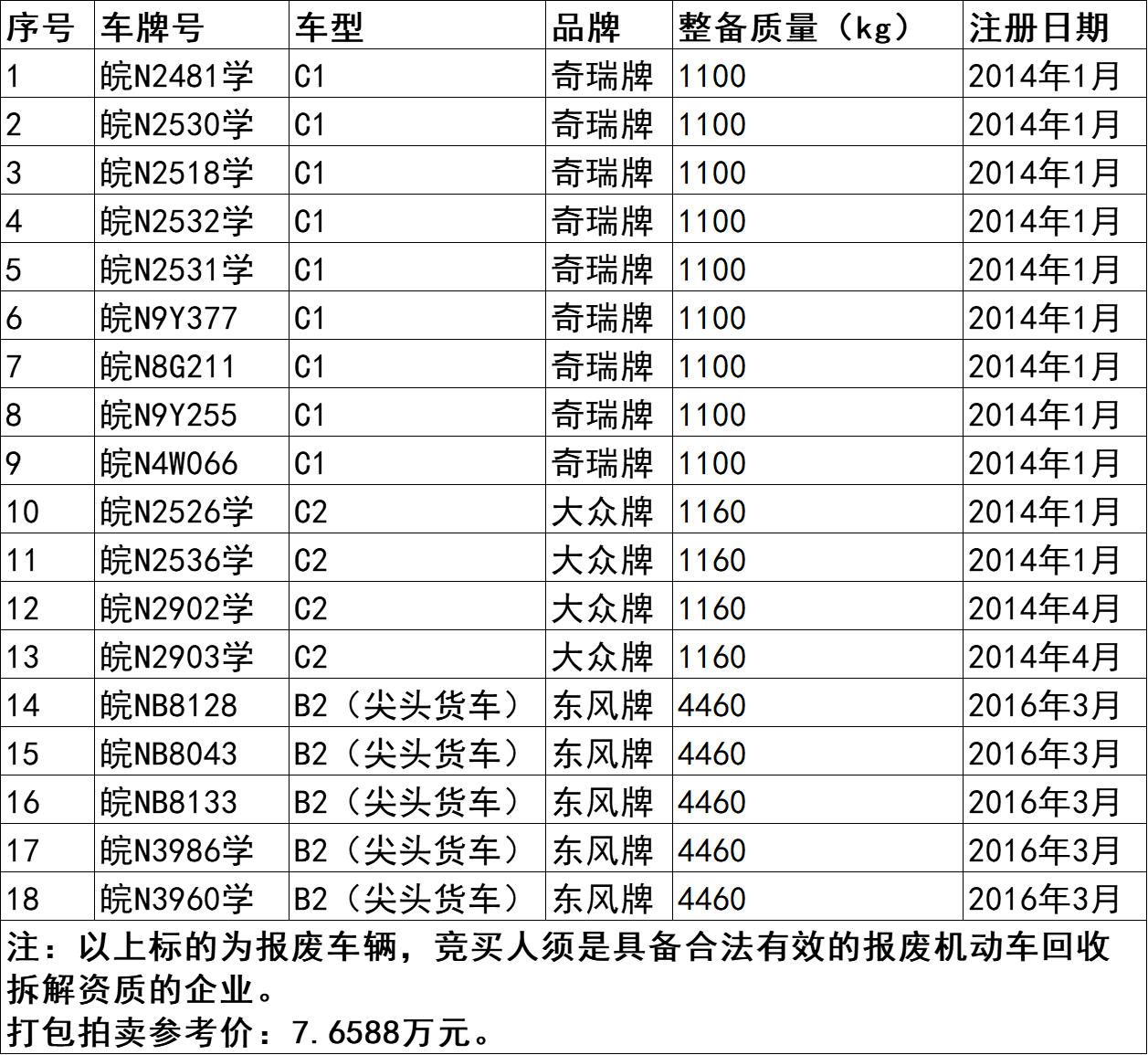 1、皖N2481學(xué)奇瑞牌小轎車、皖N2526學(xué)大眾牌小轎車、皖NB8128東風(fēng)牌尖頭貨車等18臺(tái)報(bào)廢車,打包拍賣。參考價(jià):7.6588萬元,競(jìng)買保證金:2萬元。標(biāo)的詳情見下方表格: