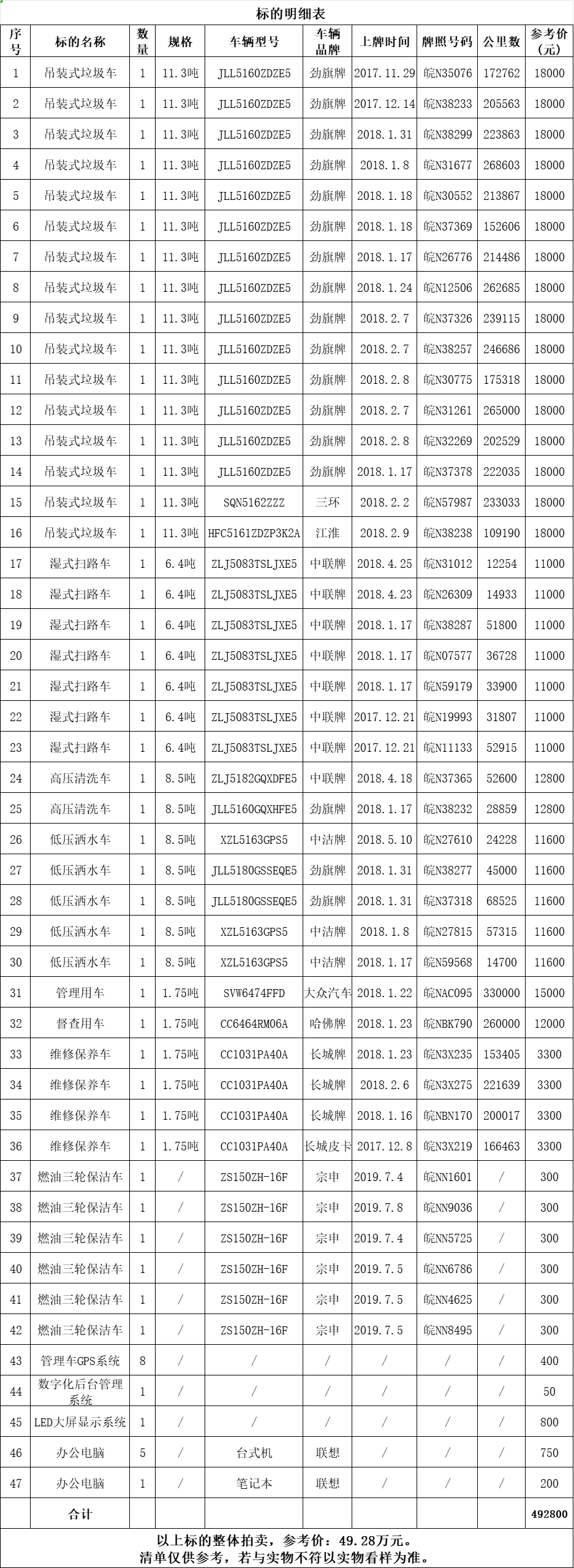 吊裝式垃圾車(chē)16輛、濕式掃路車(chē)7輛、高壓清洗車(chē)2輛、低壓灑水車(chē)5輛、管理用車(chē)1輛、督查用車(chē)1輛、維修保養(yǎng)車(chē)4輛、燃油三輪保潔車(chē)6輛、辦公電腦6臺(tái)以及管理車(chē)GPS系統(tǒng)等整體拍賣(mài),拍賣(mài)參考價(jià):49.28萬(wàn)元。