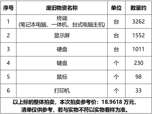 一、拍賣標(biāo)的:電腦、硬盤、打印機(jī)等廢舊物資一批,參考價:18.9618萬元。競買保證金:5萬元。