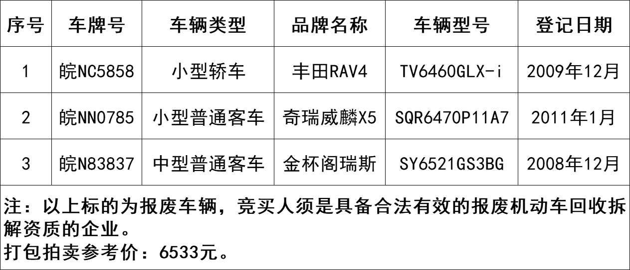 皖NC5858豐田RAV4、皖NN0785奇瑞威麟X5、皖N83837金杯閣瑞斯等3輛報(bào)廢車(chē),打包拍賣(mài)。參考價(jià):6533元,競(jìng)買(mǎi)保證金:5000元。標(biāo)的詳情見(jiàn)下方表格: