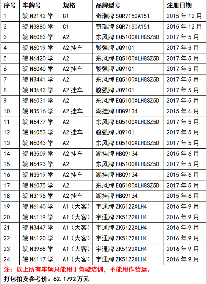 皖N2142學(xué)、皖N3880學(xué)奇瑞牌小轎車、皖N6140學(xué)宇通牌大客等24臺二手車,打包拍賣。參考價:62.1792萬元,競買保證金:6萬元。標(biāo)的詳情見下方表格: